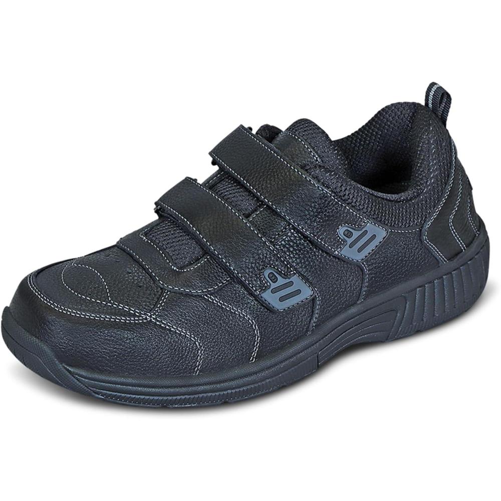 Orthofeet Men’s Orthopedic Alamo Adjustable Strap Leather Walking Sneaker(Black)